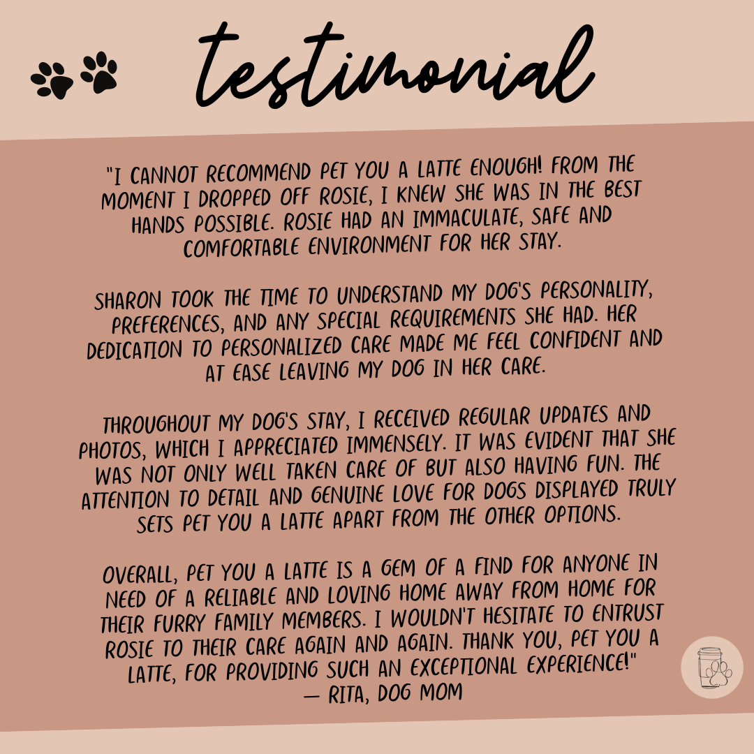 “I cannot recommend Pet You A Latte enough! From the moment I dropped off Rosie, I knew she was in the best hands possible. Rosie had an immaculate, safe and comfortable environment for her stay.” [READ MORE HERE]